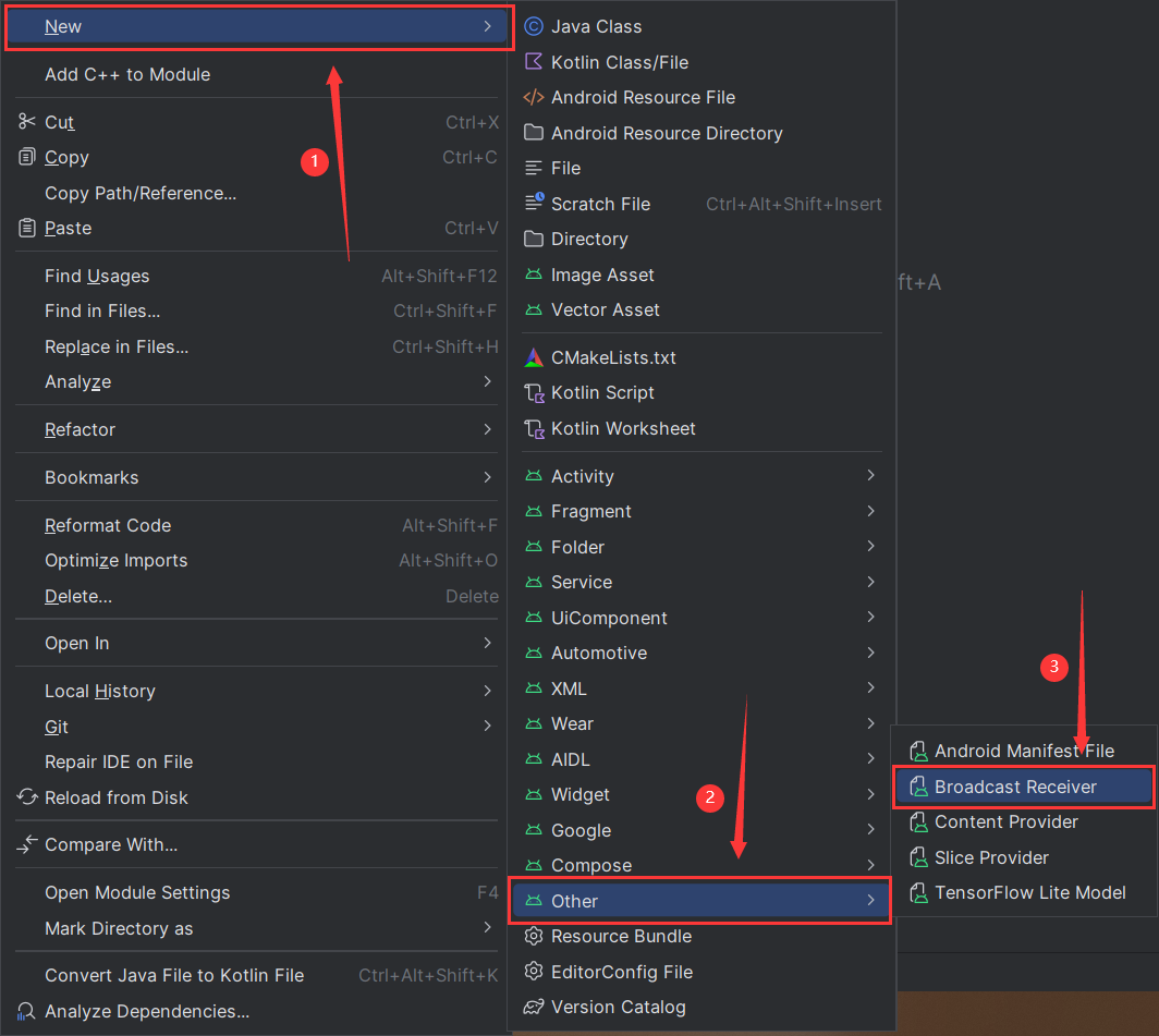 以接收开机广播为例,在 Android Studio 中右键新建BroadcastReceiver,会将其自动添加到Manifest.xml。新建窗口中的Exported表示是否允许这个BroadcastReceiver接收本程序以外的广播,Enabled表示是否启用这个BroadcastReceiver。